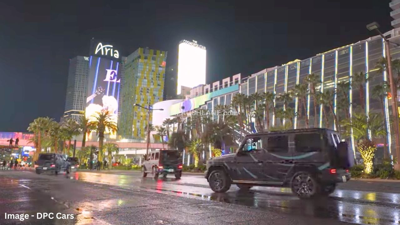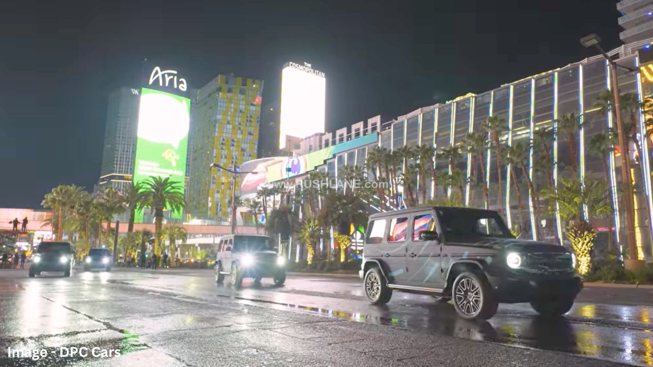 Mercedes has showcased the 360° tank turn feature of its new Electric G-Class in multiple videos posted earlier. The company has chosen to call this feature the ‘G’ turn. Taking it a step further, 4 EQG prototypes can be seen performing synchronized 360° tank turns at the Las Vegas Strip. The spectacular show highlights the superior technological prowess of electric cars in comparison to ICE vehicles.